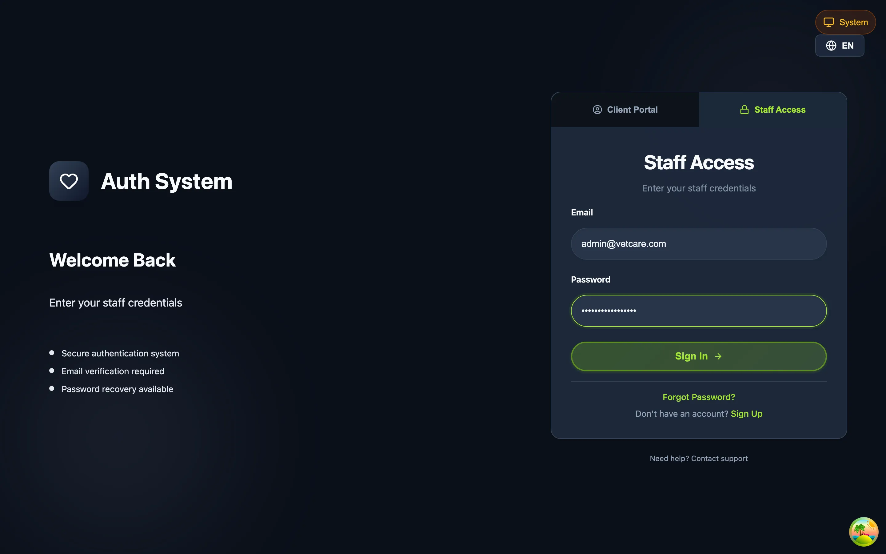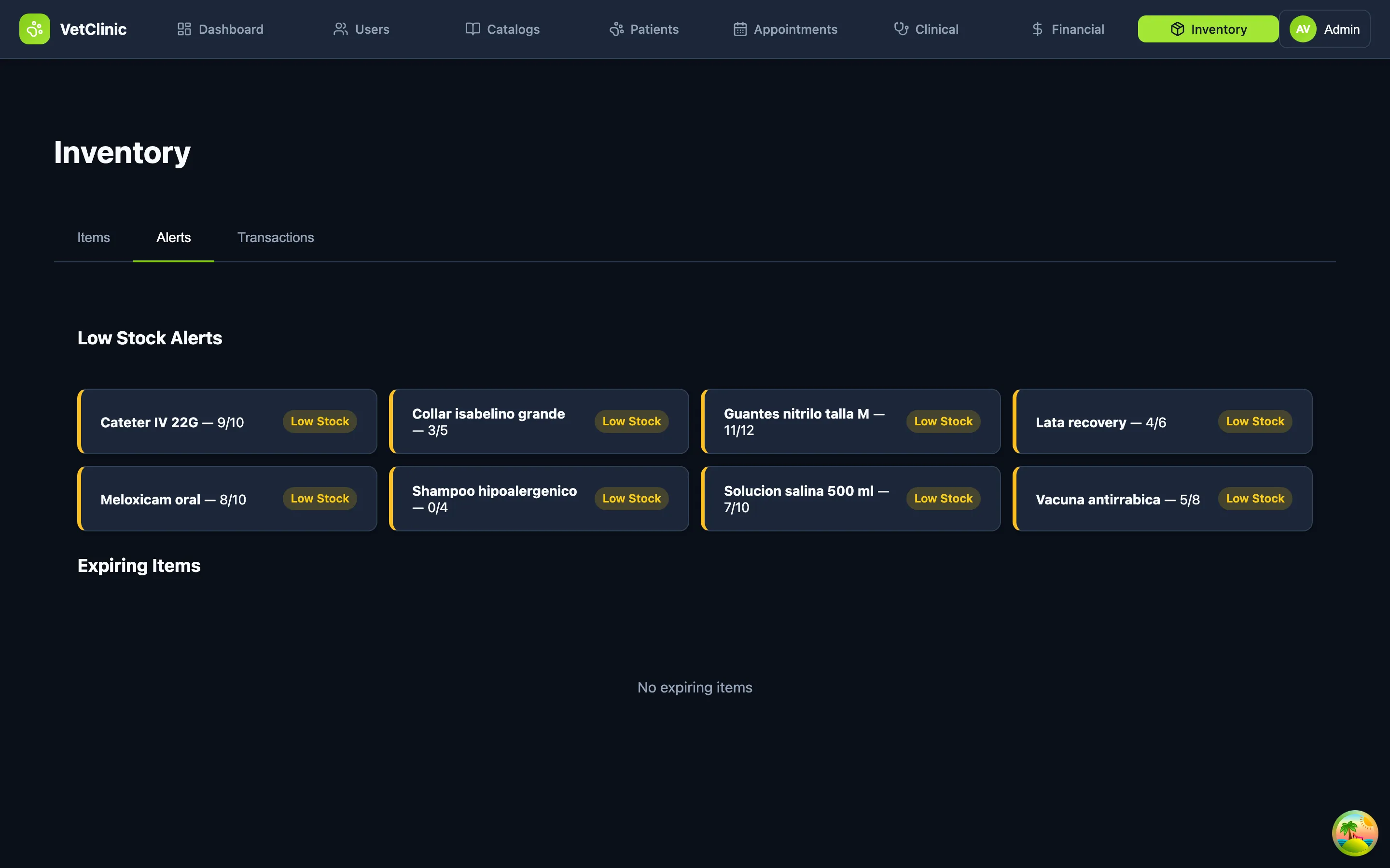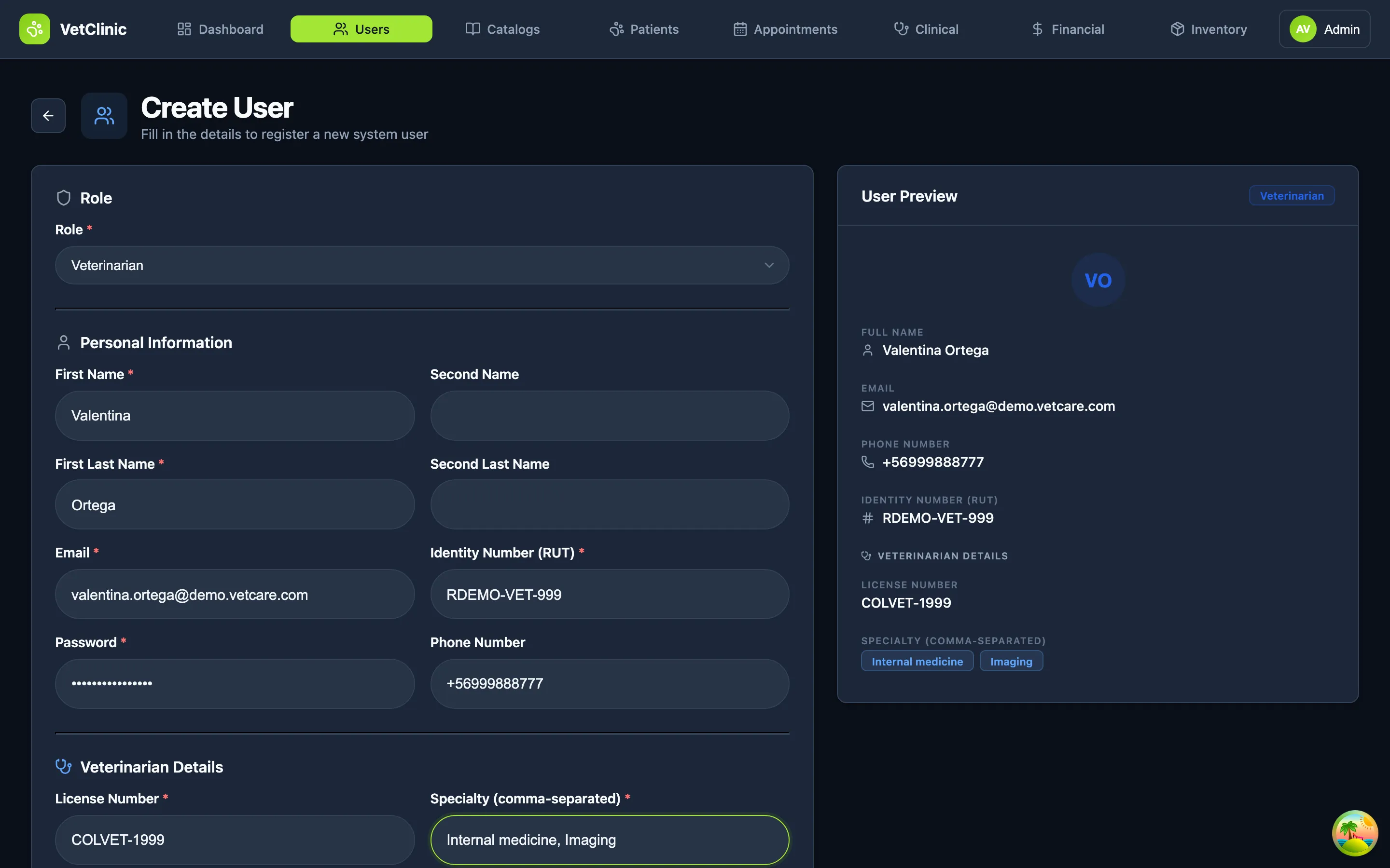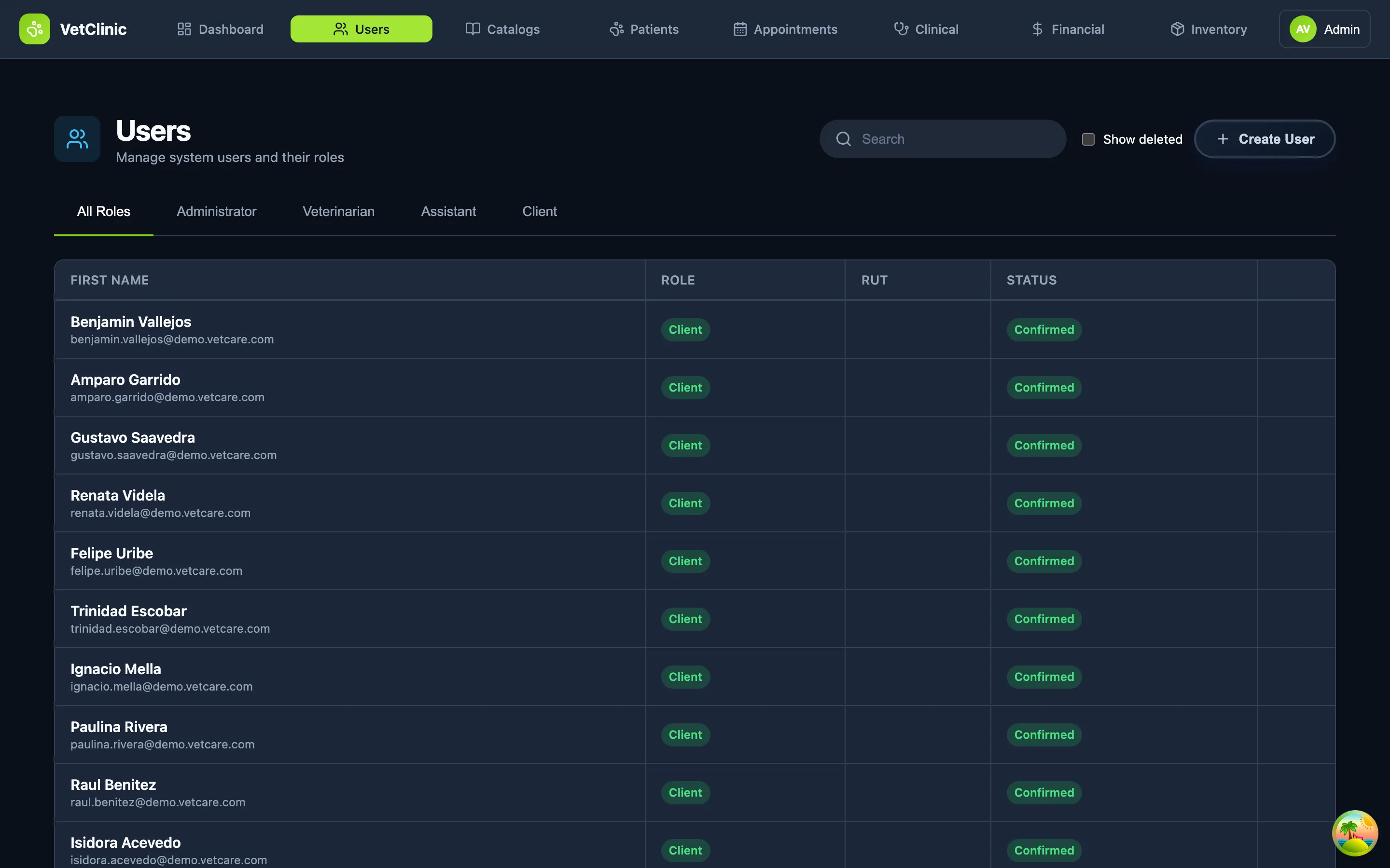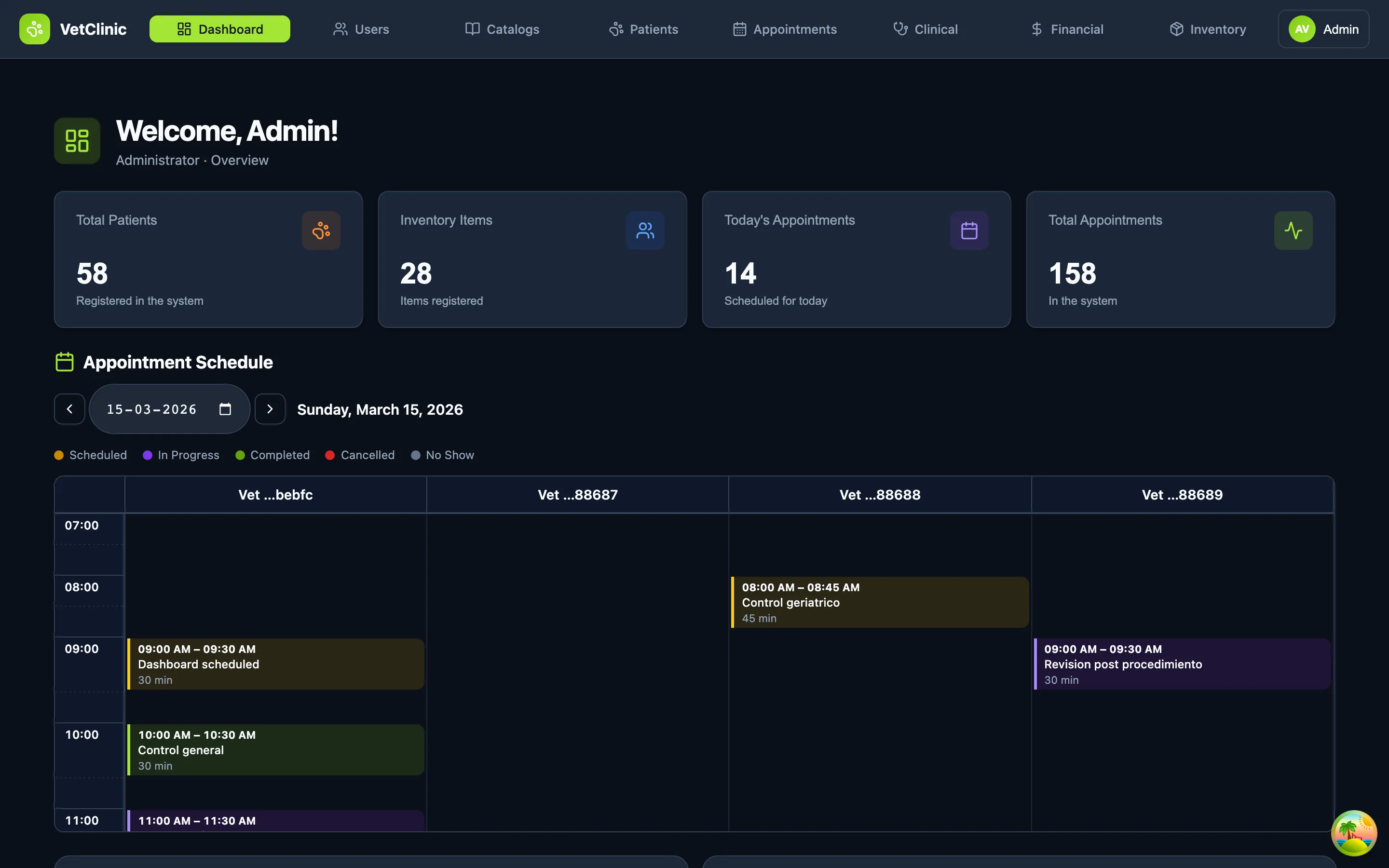 VetCare es un sistema de gestión veterinaria que cubre el ciclo completo de operación de una clínica, construido con el stack MERN (MongoDB, Express 5, React 19, Node.js) y TypeScript de extremo a extremo. Arquitectura monorepo con autenticación JWT, control de roles (RBAC) con 5 roles diferenciados, historial clínico alineado con FHIR, facturación con pagos parciales, inventario con trazabilidad e internacionalización completa (ES/EN).
