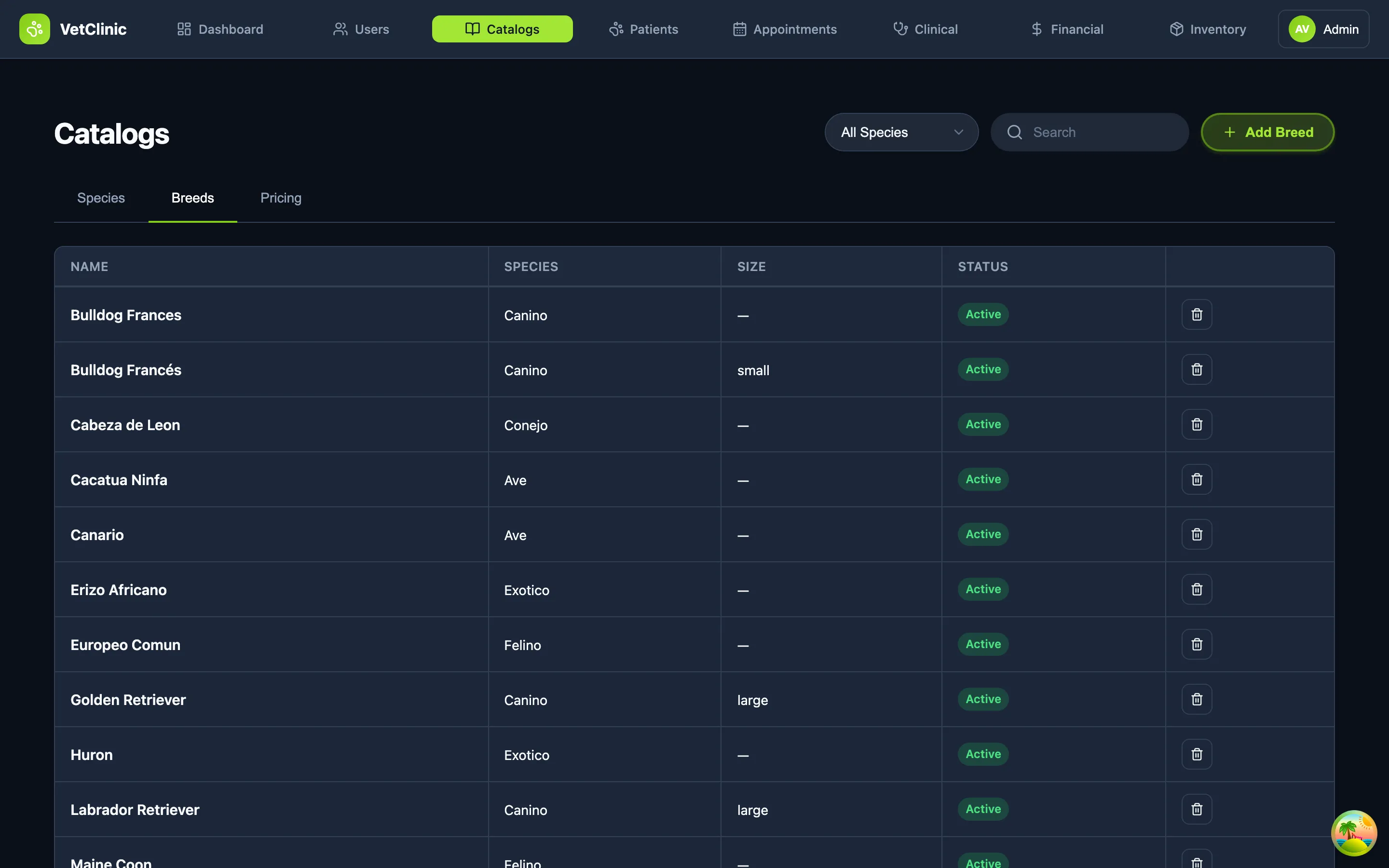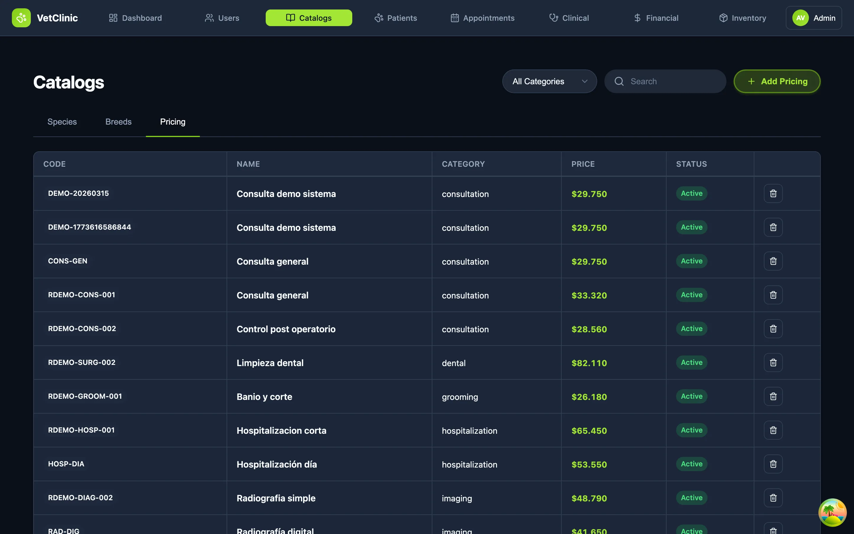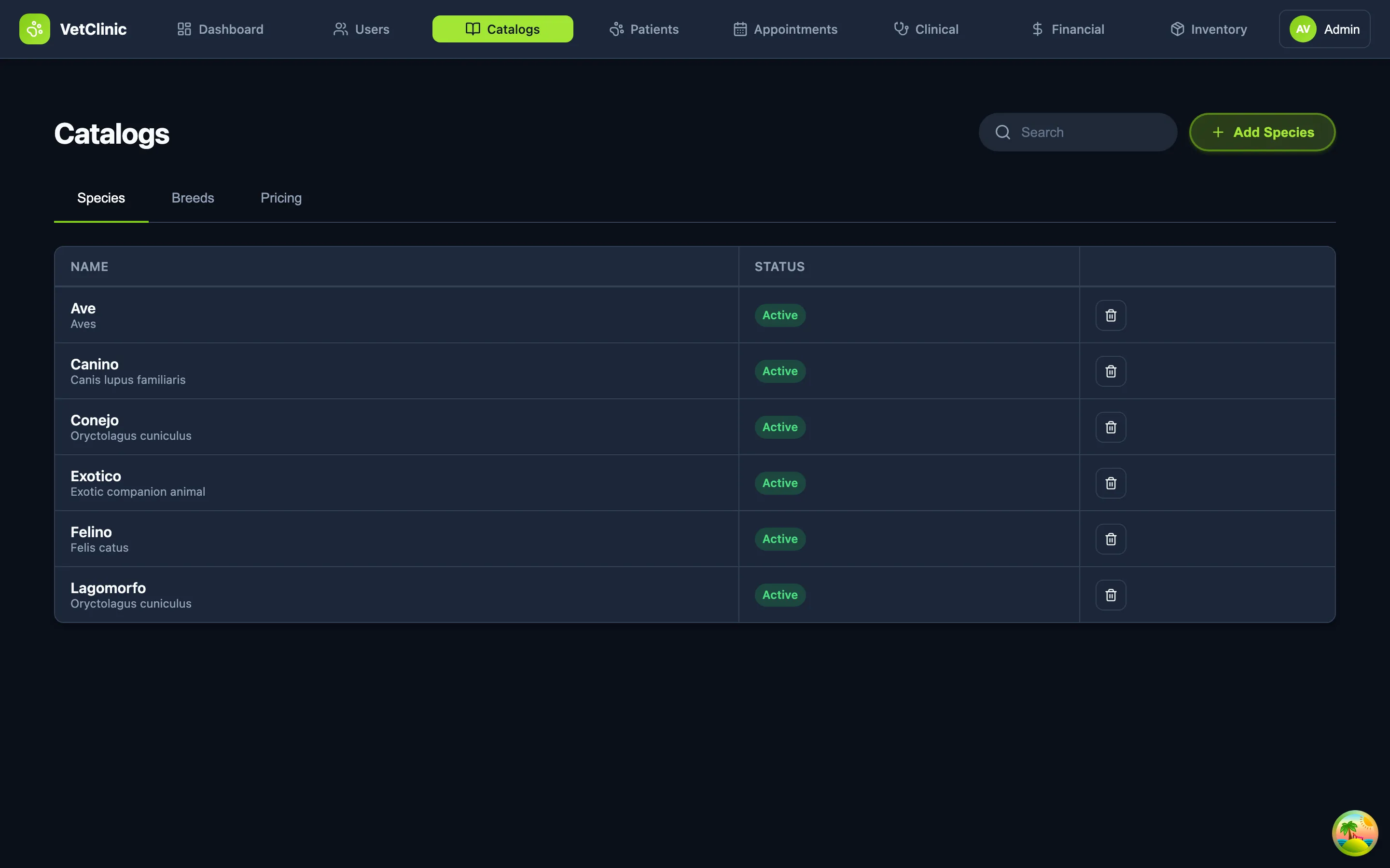 - Catálogos (9) — Especies, razas y precios con vigencias temporales