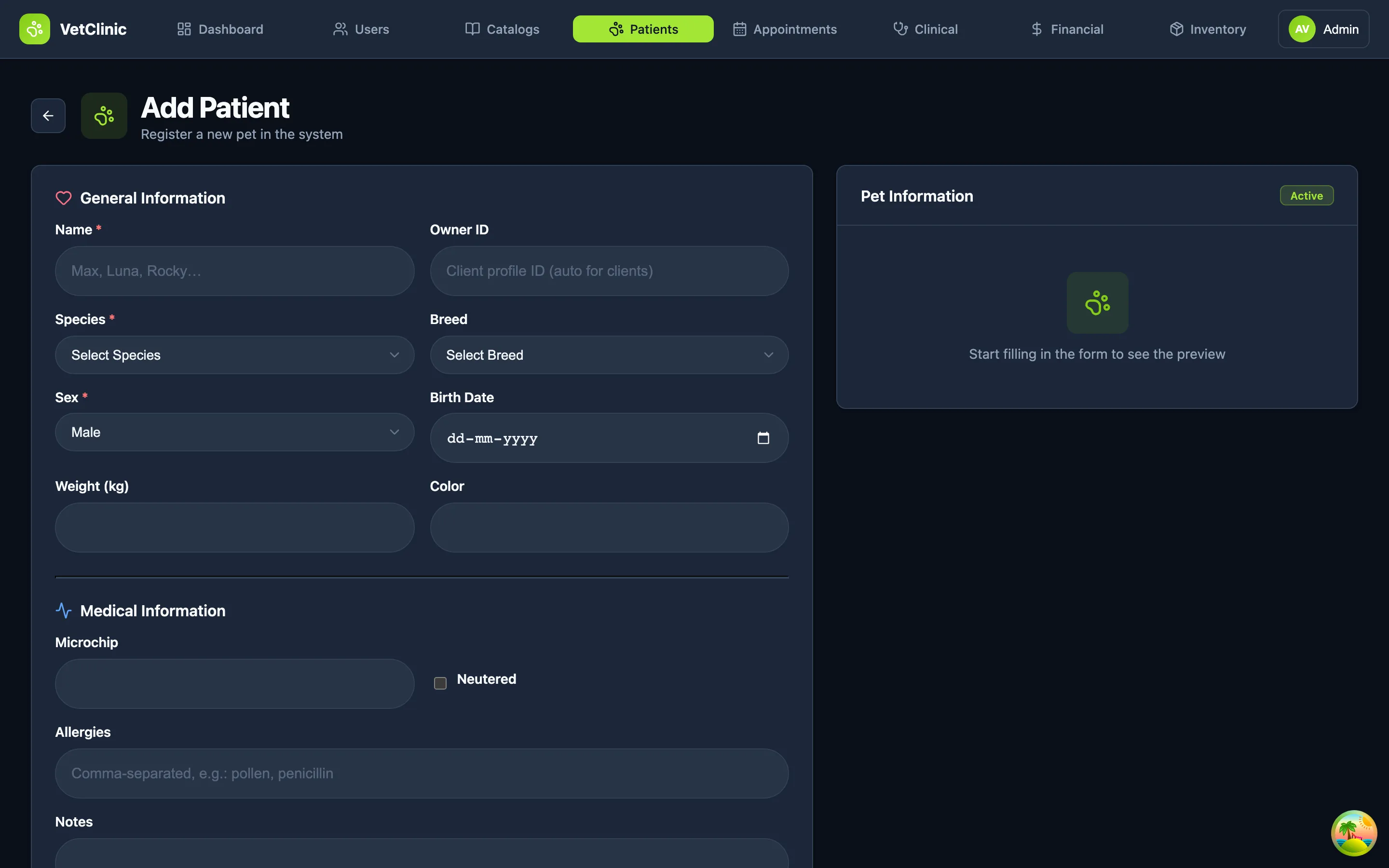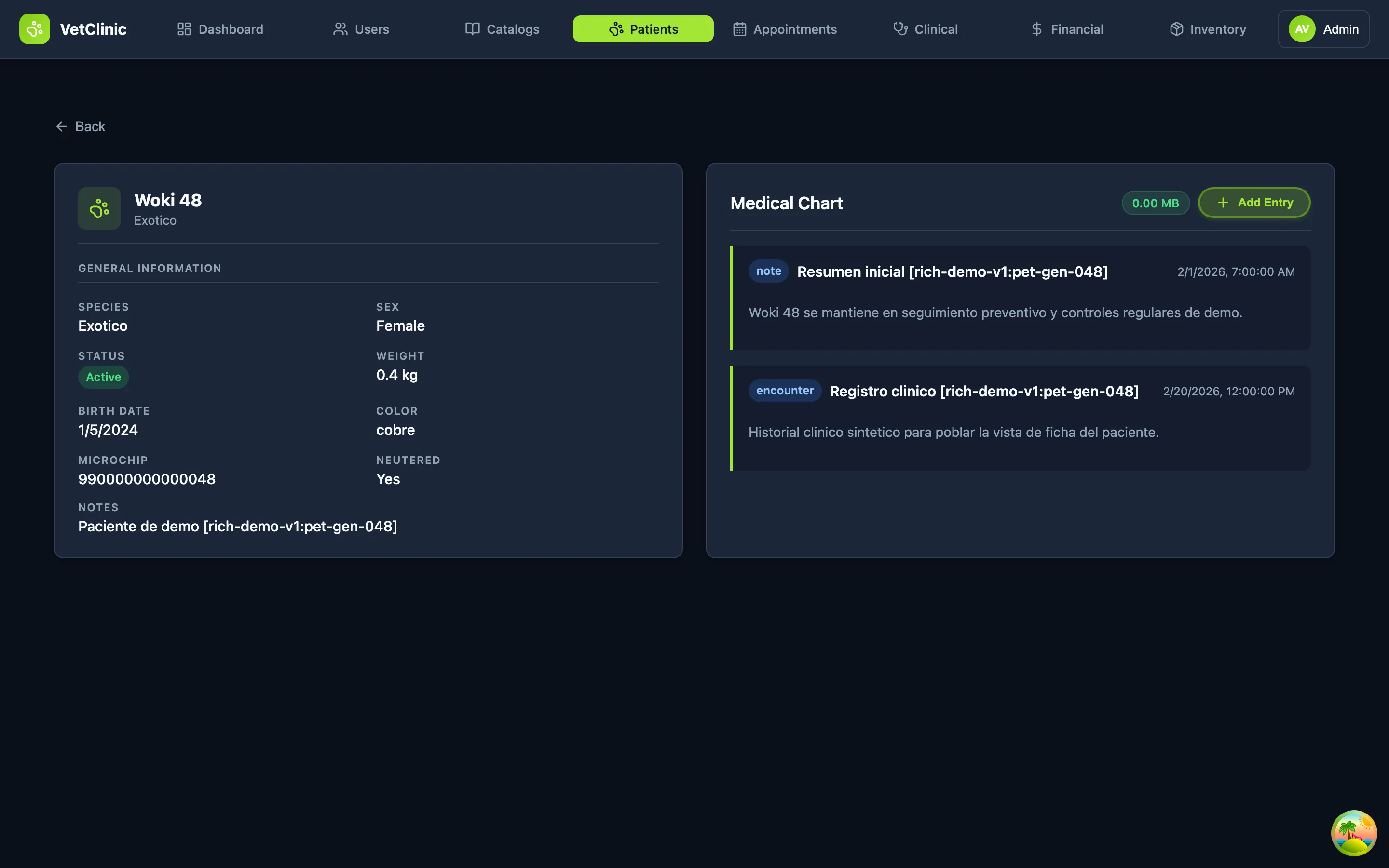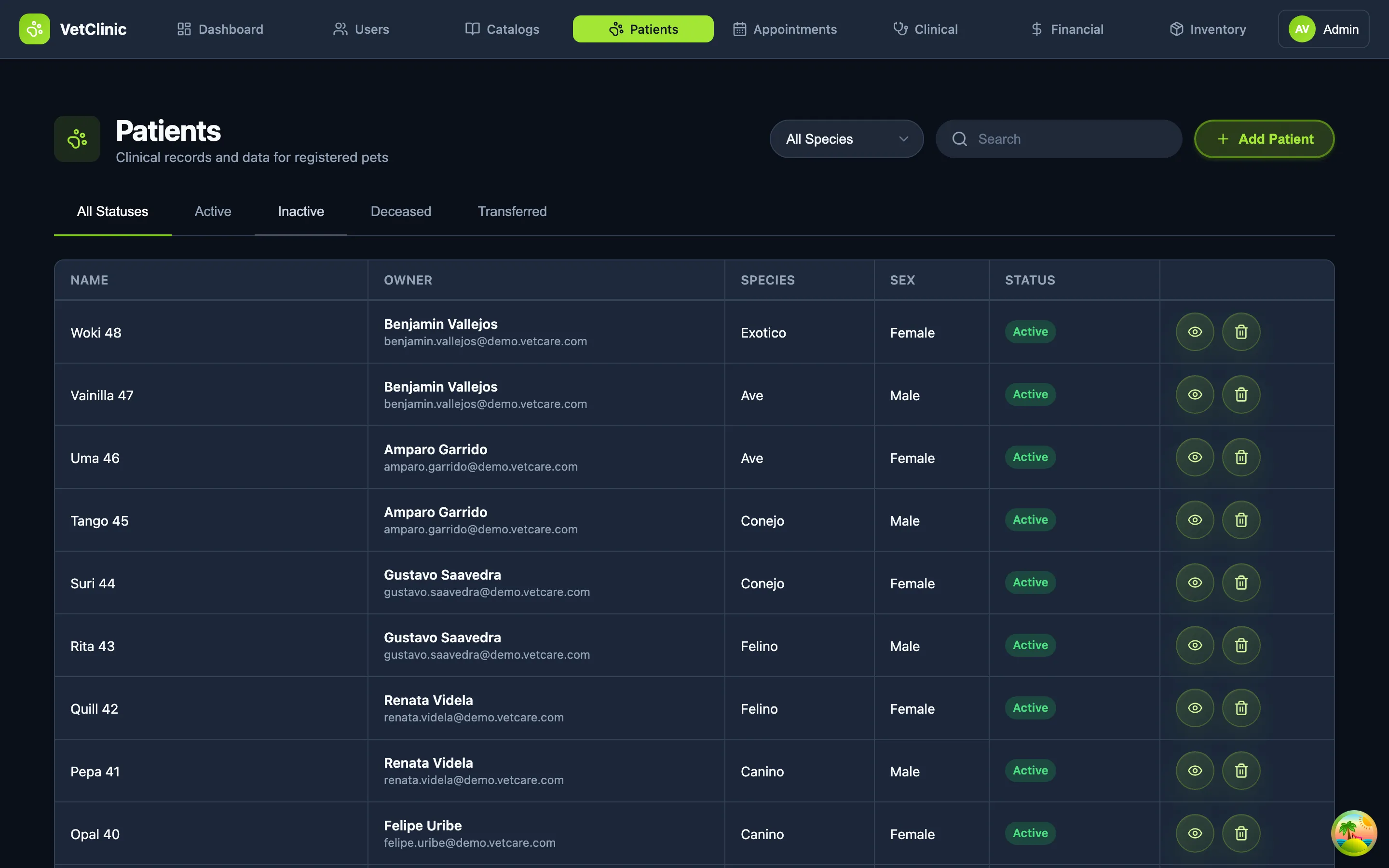 - Pacientes (8) — Registro de mascotas, historial médico (Charts), asociación con dueño