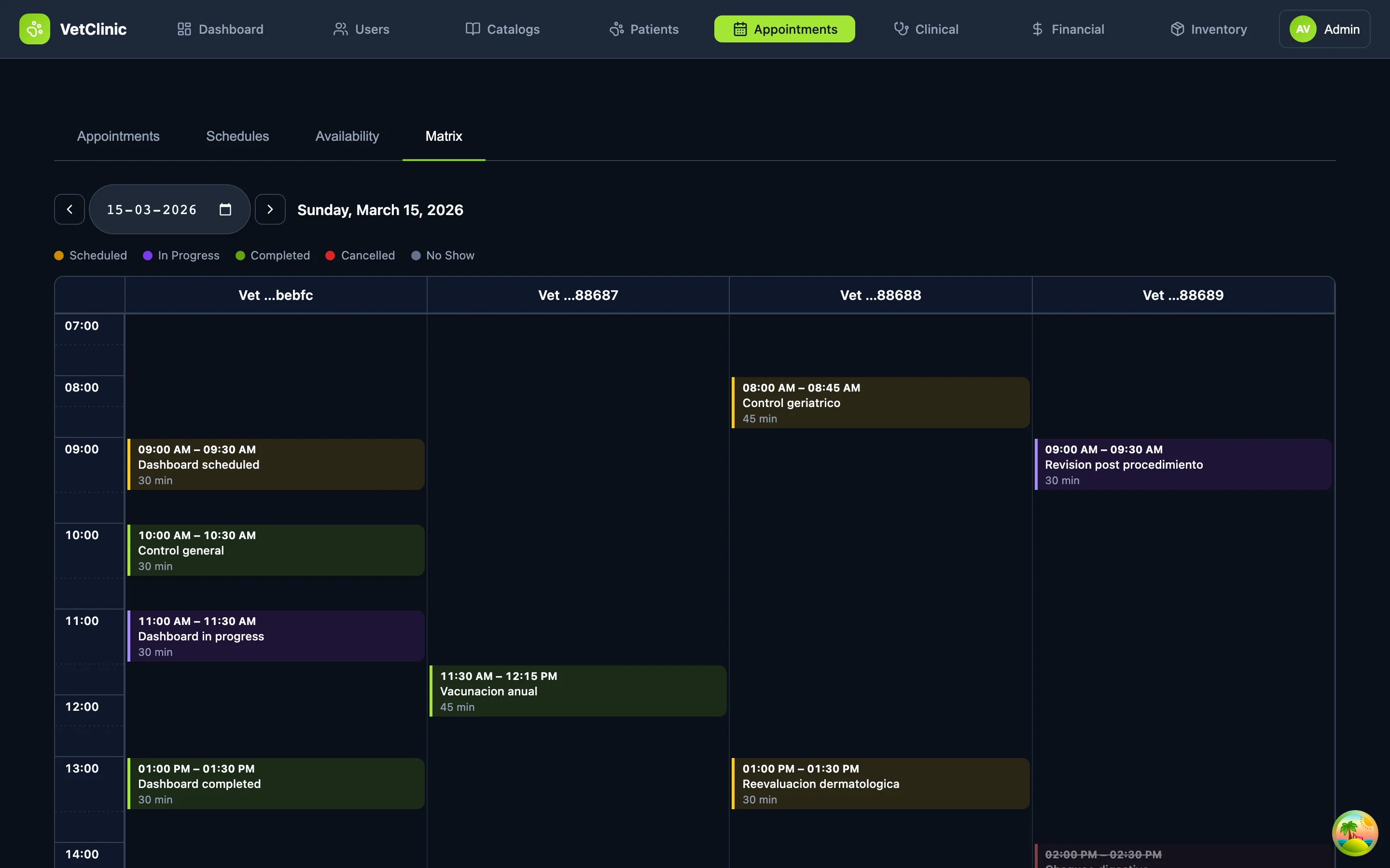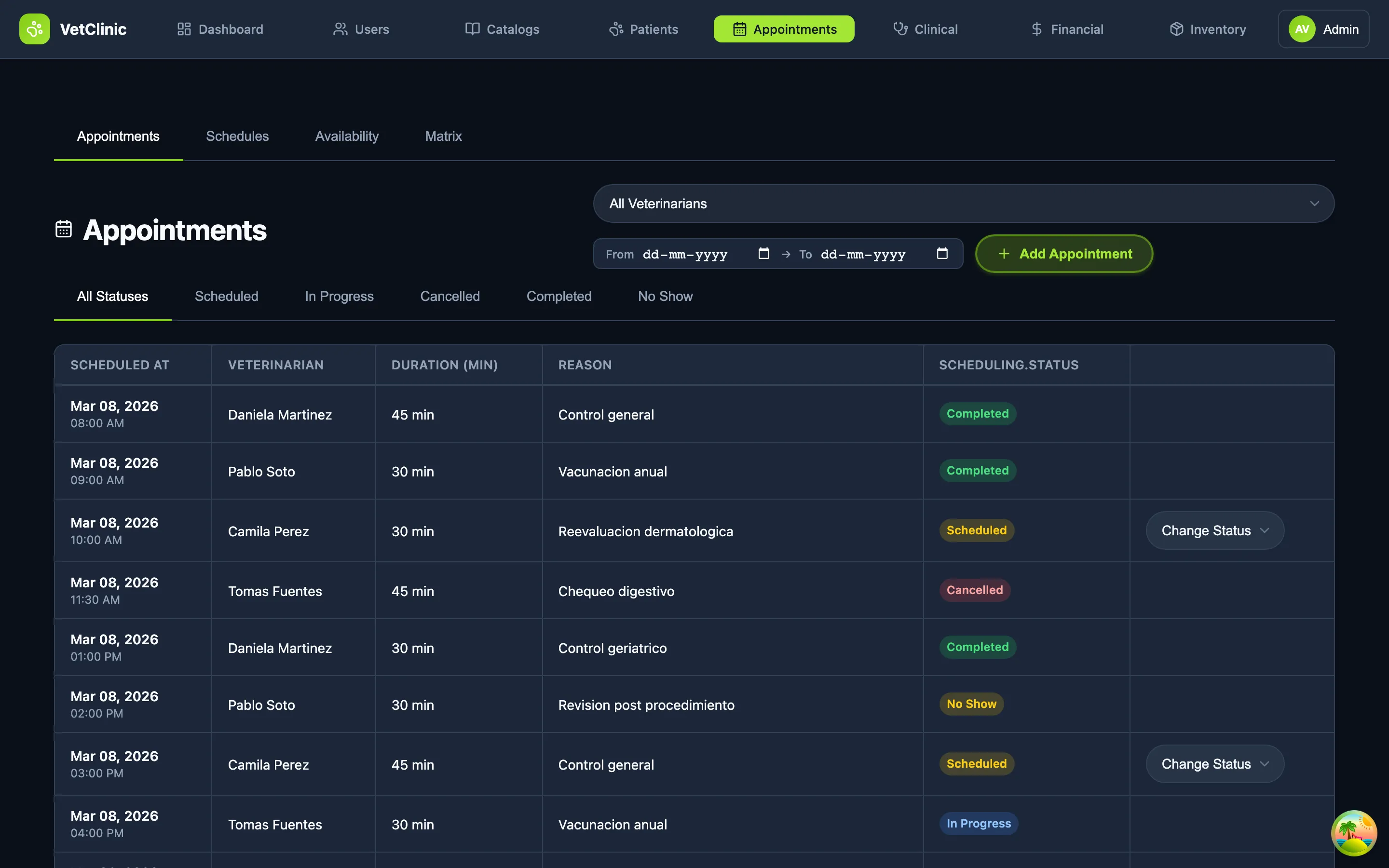 - Agendamiento (12) — Horarios del staff, citas con validación de solapamiento, veterinario sustituto