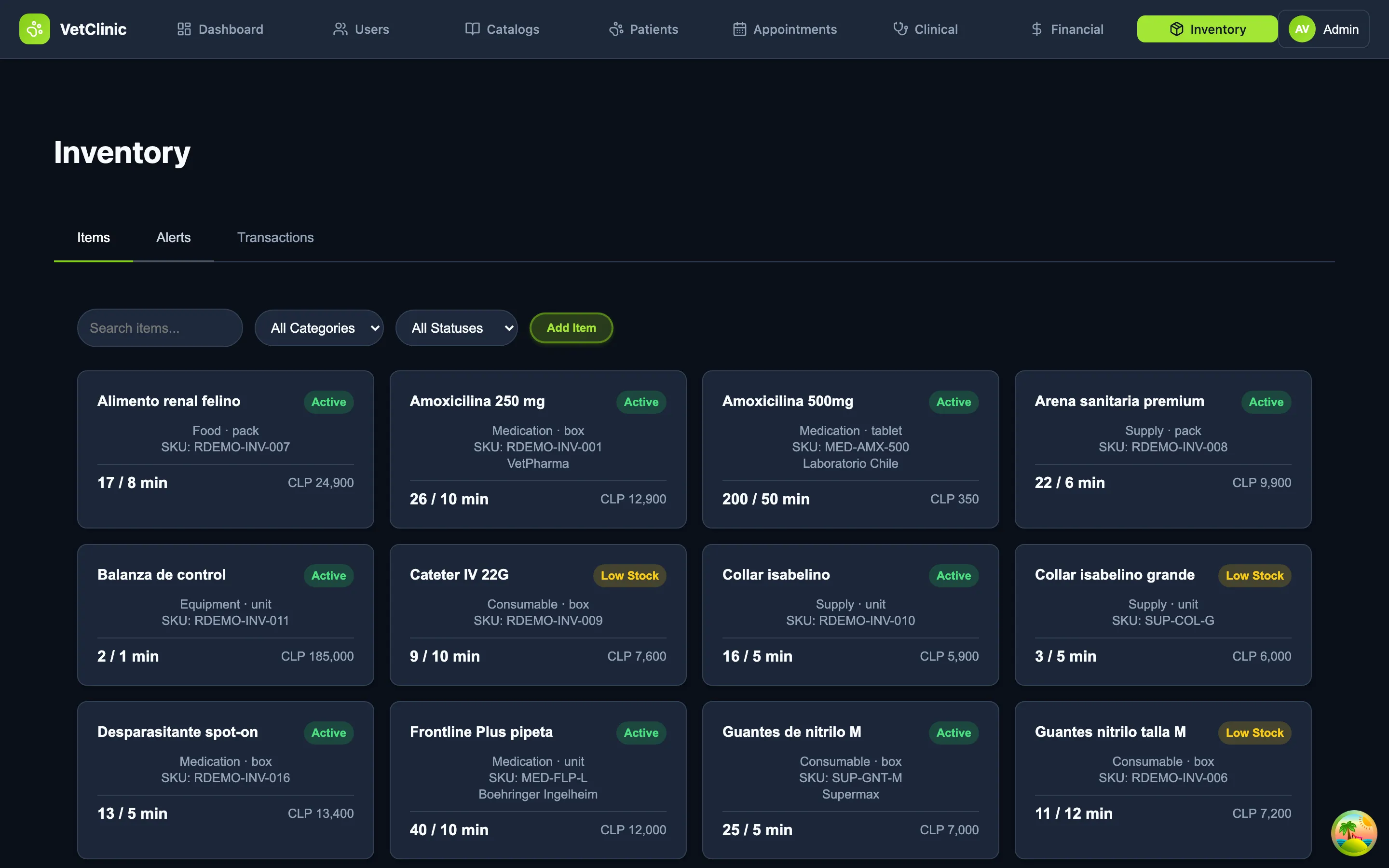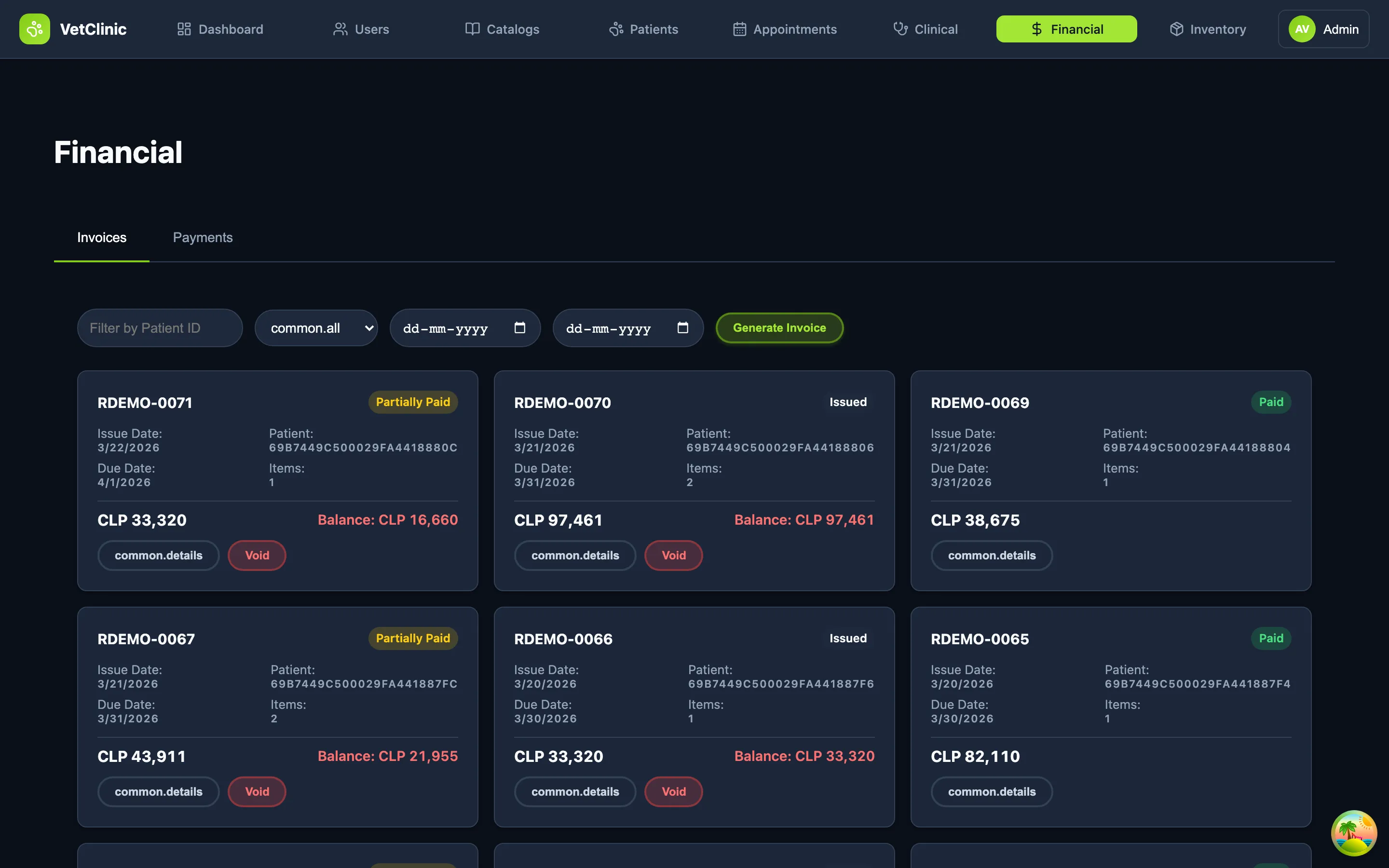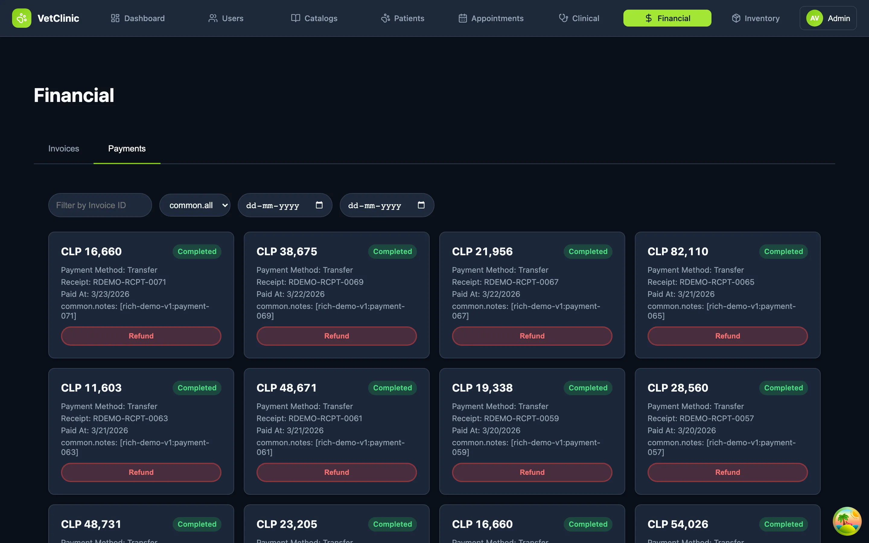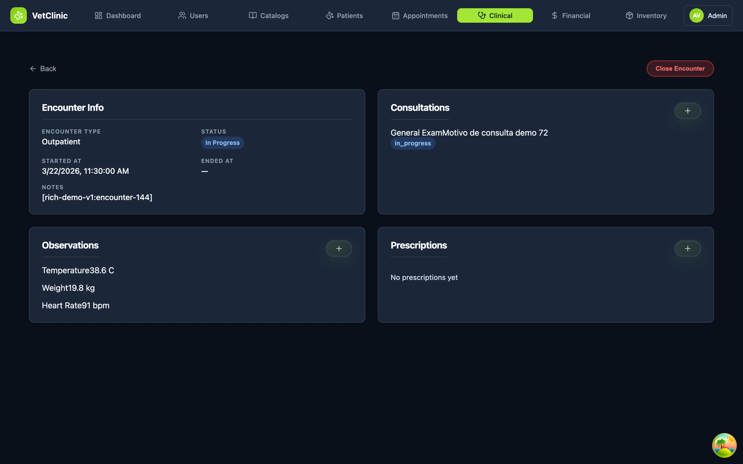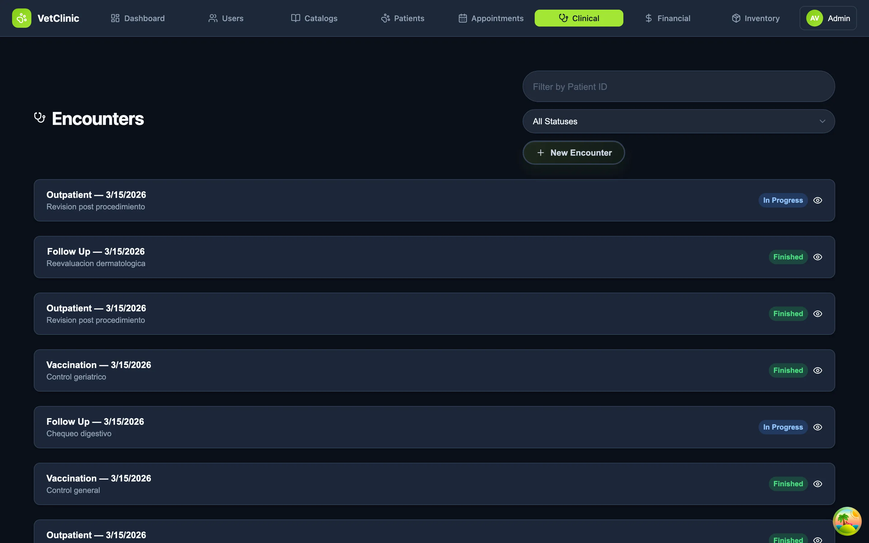 Aplicación full-stack para gestión integral de clínicas veterinarias con MERN (MongoDB, Express 5, React 19, Node.js). Arquitectura monorepo con TypeScript, autenticación JWT, RBAC, historial clínico FHIR, facturación, inventario y agendamiento.